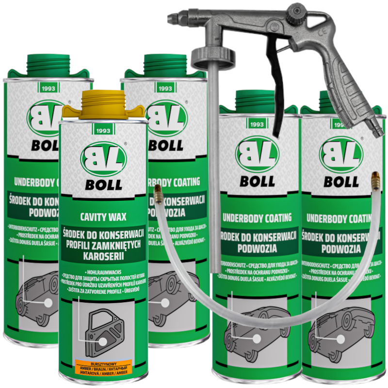 BOLL ŚRODEK DO KONSERWACJI PODWOZIA 4L (4x1L) + BOLL ŚRODEK DO KONSERWACJI PROFILI ZAMKNIĘTYCH (Bursztynowy) + PISTOLET NOVOL UBS DO KONSERWACJI