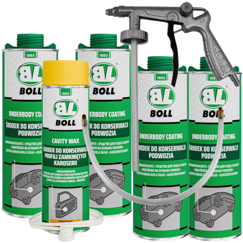 BOLL ŚRODEK DO KONSERWACJI PODWOZIA 4L (4x1L) + BOLL ŚRODEK DO KONSERWACJI PROFILI ZAMKNIĘTYCH (Bursztynowy) SPRAY 500ml + PISTOLET NOVOL UBS DO KONSERWACJI