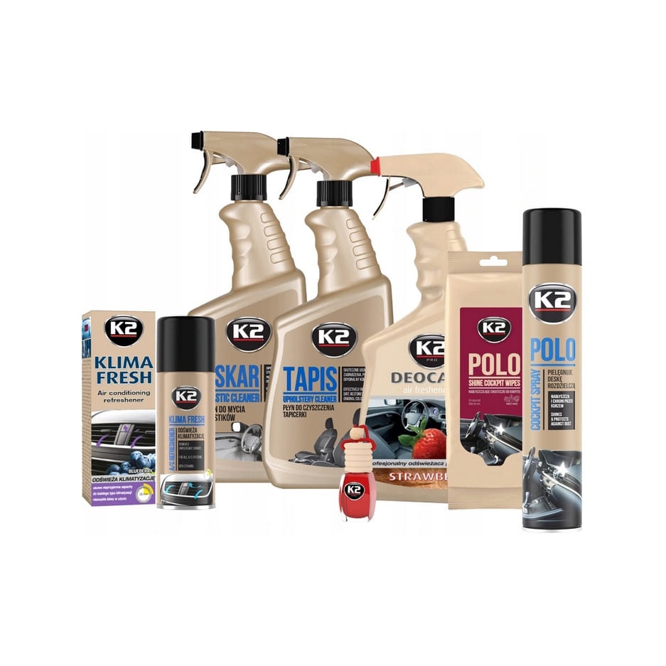 K2 ZESTAW KOSMETYKÓW DO PIELĘGNACJI SAMOCHODUZestaw zawiera: * K2 OSKAR PŁYN DO PLASTIKÓW K217M * K2 TAPIS PŁYN DO TAPICERKI K207M * K2 DEOCAR ODŚWIEŻACZ M115SM * K2 POLO PROTECTANT CHUSTECZKI K420 * K2 POLO COCKPIT FRESH 750ml K407FR0 * K2 KLIMA FRESH BLUEBERRY ODŚWIEŻACZ K222BB * K2 VENTO SOLO TRUSKAWKA ODŚWIEŻACZ V401# K2 OSKAR 770 ML Płyn do czyszczenia plastikówSpecyfikacja: * Nr fabryczny: K217M K2 * Producent: K2 * Pojemność: 770 ml * Linia: K2 PERFECTK2 OSKAR to bezpieczny w użyciu środek do czyszczenia plastików oraz powierzchni z tworzyw, gumy, linoleum czy skaju. Wysoce skoncentrowany pozwala na bardzo łatwe czyszczenie i usuwanie zaschniętych zabrudzeń z elementów plastikowych. Można go również stosować do mycia mebli ogrodowych i innych akcesoriów domowych.Nowa receptura K2 OSKAR została tak opracowana, aby przy zachowaniu swojej bardzo wysokiej skuteczności pozostawić pH zbliżone do neutralnego. Pianka, która tworzy się przy użyciu atomizera, utrzymuje rozpuszczony brud, co ułatwia czyszczenie powierzchni.K2 OSKAR jest bezpieczny zarówno dla użytkownika, jak i wszystkich czyszczonych elementów. Dodatkowo po zastosowaniu K2 OSKAR wnętrze wypełnia przyjemny zapach.Cechy produktu: * do czyszczenia wszelkiego rodzaju plastikowych elementów * mocno skoncentrowany - neutralne pH - łatwe usuwanie nieczystości * ma przyjemny zapach * odświeża czyszczone elementySposób użycia: 1. Nanieść na zabrudzone powierzchnie. 2. Odczekać kilkanaście do 30 sekund aż środek rozpuści brud, nie czekać aż całkiem wyschnie. 3. Zebrać pianę z rozpuszczonym brudem. 4. Wytrzeć do sucha.# K2 TAPIS 770 ML Płyn do czyszczenia tapicerkiSpecyfikacja: * Nr fabryczny: K207M K2 * Producent: K2 * Pojemność: 770 ml * Linia: K2 PERFECTK2 TAPIS jest bezwzględnym dla brudu środkiem do czyszczenia tapicerki. Nawet mocno zaschnięte plamy zostaną skutecznie usunięte. K2 TAPIS wnika głęboko w strukturę tkanin i przywraca czyszczonym powierzchniom ich naturalną barwę.Dzięki temu, że K2 TAPIS ma konsystencję pianki, może długo penetrować czyszczoną powierzchnię, jednocześnie pozostając na miejscu i utrzymując rozbity brud na powierzchni.Może być stosowany do profesjonalnego czyszczenia tapicerek naturalnych, z tworzyw sztucznych, dywanów, obuwia i innych tkanin.Sposób użycia: 1. Przed użyciem wstrząsnąć. 2. Sprawdzić działanie produktu w niewidocznym miejscu. 3. Spryskać czyszczoną powierzchnię. 4. Pozostawić na chwilę, aby środek rozbił brud. 5. Ściągnąć roztwór z usuniętymi zabrudzeniami przy pomocy wilgotnej mikrofibry lub odkurzacza.# K2 DEOCAR STRAWBERRY 700 ML Profesjonalny odświeżacz powietrzaSpecyfikacja: * Nr fabryczny: M115SM K2 * Producent: K2 * Pojemność: 700 ml * Linia: K2 PROK2 DEOCAR to profesjonalny odświeżacz powietrza o ekskluzywnym oraz bardzo intensywnym aromacie, dzięki zastosowaniu wysokich stężeń kompozycji zapachowej, takich jak w perfumach. Specjalnie dobrana kompozycja neutralizuje nieprzyjemne zapachy. Idealny do użycia przez profesjonalne pralnie tapicerek samochodowych po wypraniu tapicerki. Sprawia, że wnętrze auta na długo wypełnia się aromatyczną wonią. K2 POLO PROTECTANT CHUSTECZKI Czyszczenie deski rozdzielczejSpecyfikacja: * Nr fabryczny: K420 K2 * Producent: K2 * Linia: K2 PERFECTPRZYWRACAJĄ KOLORK2 POLO PROTECTANT CHUSTECZKI \- czyszczą i pielęgnują elementy z tworzywa sztucznego wewnątrz samochodu. Przywracają ich naturalny wygląd, by znów wyglądały jak nowe.NABŁYSZCZAJĄWydobywają pierwotny kolor i blask czyszczonych powierzchni.CHRONIĄ PRZED KURZEMDzięki właściwościom antystatycznym, zapobiegają nadmiernemu gromadzeniu się kurzu.SPOSÓB UŻYCIA: 1. Otworzyć opakowanie pociągając za część oznaczoną strzałką. 2. Następnie wyciągnąć chusteczkę. 3. Szczelnie zamknąć opakowanie, aby utrzymać wilgoć. 4. Przetrzeć powierzchnię ściereczką, do uzyskania pożądanego efektu. Jeżeli to konieczne, czynność powtórzyć. 5. Pozostawić czyszczoną powierzchnię do wyschnięcia.OPAKOWANIE: 25 szt.# K2 POLO COCKPIT 750 ML Spray do pielęgnacji deski rozdzielczejSpecyfikacja: * Nr fabryczny: K407FR0 * Producent: K2 * Pojemność: 750 ml * Linia: K2 PERFECTK2 POLO COCKPIT to spray do pielęgnacji i konserwacji deski rozdzielczej. Zawiera specjalne nanocząsteczki, dzięki którym w łatwy i szybki sposób zabezpieczy cały kokpit, przywróci głęboką barwę oraz wyrazistą fakturę czyszczonych elementów.Produkt wnika w czyszczony materiał, wydobywając intensywny kolor i blask deski rozdzielczej. Antystatyczna formuła utrudnia ponowne osadzanie kurzu oraz chroni przed niekorzystnym działaniem promieni UV. Całkowicie bezpieczny dla czyszczonych powierzchni. Zapobiega przedwczesnemu starzeniu się materiałów takich jak plastik, winyl, guma i inne tworzywa sztuczne.K2 POLO COCKPIT intensywnie czyści, nabłyszcza i chroni przed przywieraniem brudu. Odświeża wnętrze auta pozostawiając jeden ze swoich czternastu delikatnych zapachów.SPOSÓB UŻYCIA: 1. Przed użyciem wstrząsnąć opakowaniem. 2. Spryskać na powierzchnię z odległości około 25 cm. 3. Polerować przy pomocy mikrofibry. K2 KLIMA FRESH BLUEBERRY 150 ML Środek do odświeżania klimatyzacjiSpecyfikacja: * Nr fabryczny: K222BB K2 * Producent: K2 * Pojemność: 150 ml * Linia: K2 PERFECTK2 KLIMA FRESH to niezwykle skuteczny i łatwy w użyciu środek do odświeżania klimatyzacji. Usuwa nieprzyjemne zapachy, które powstają na skutek zanieczyszczeń i wilgoci w układzie wentylacyjnym. Cały proces nie zabiera więcej niż kilkanaście minut. Nadaje się do każdego typu klimatyzacji. Po użyciu pozostawia świeży zapach.SPOSÓB UŻYCIA: 1. Zamknąć wszystkie drzwi i okna. 2. Ustawić nadmuch powietrza na maksymalną siłę, recyrkulację na obieg zamknięty, klimatyzację na zimno. 3. Przesunąć fotel kierowcy maksymalnie do przodu i położyć oparcie.
